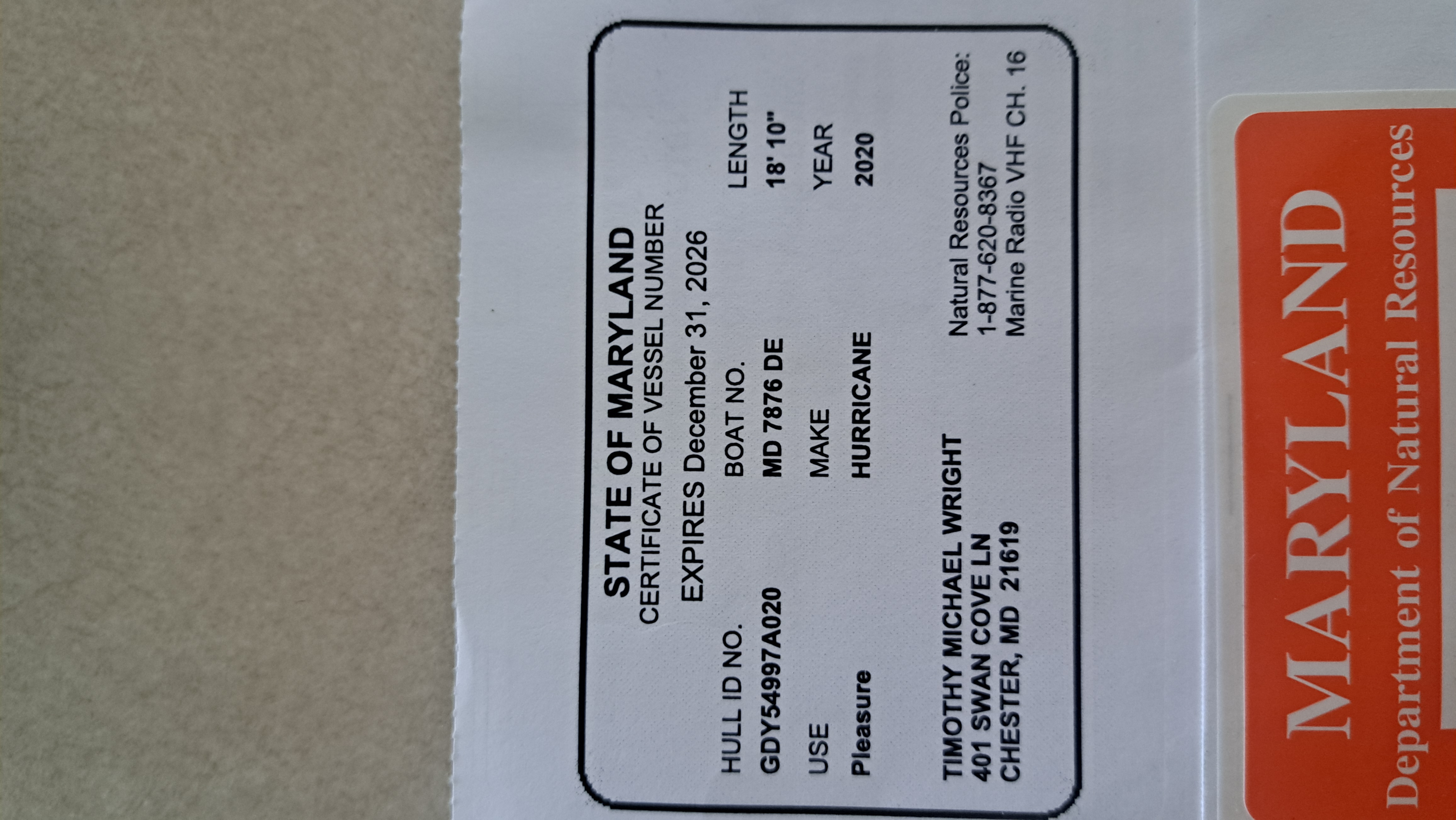 Boat Registration Card